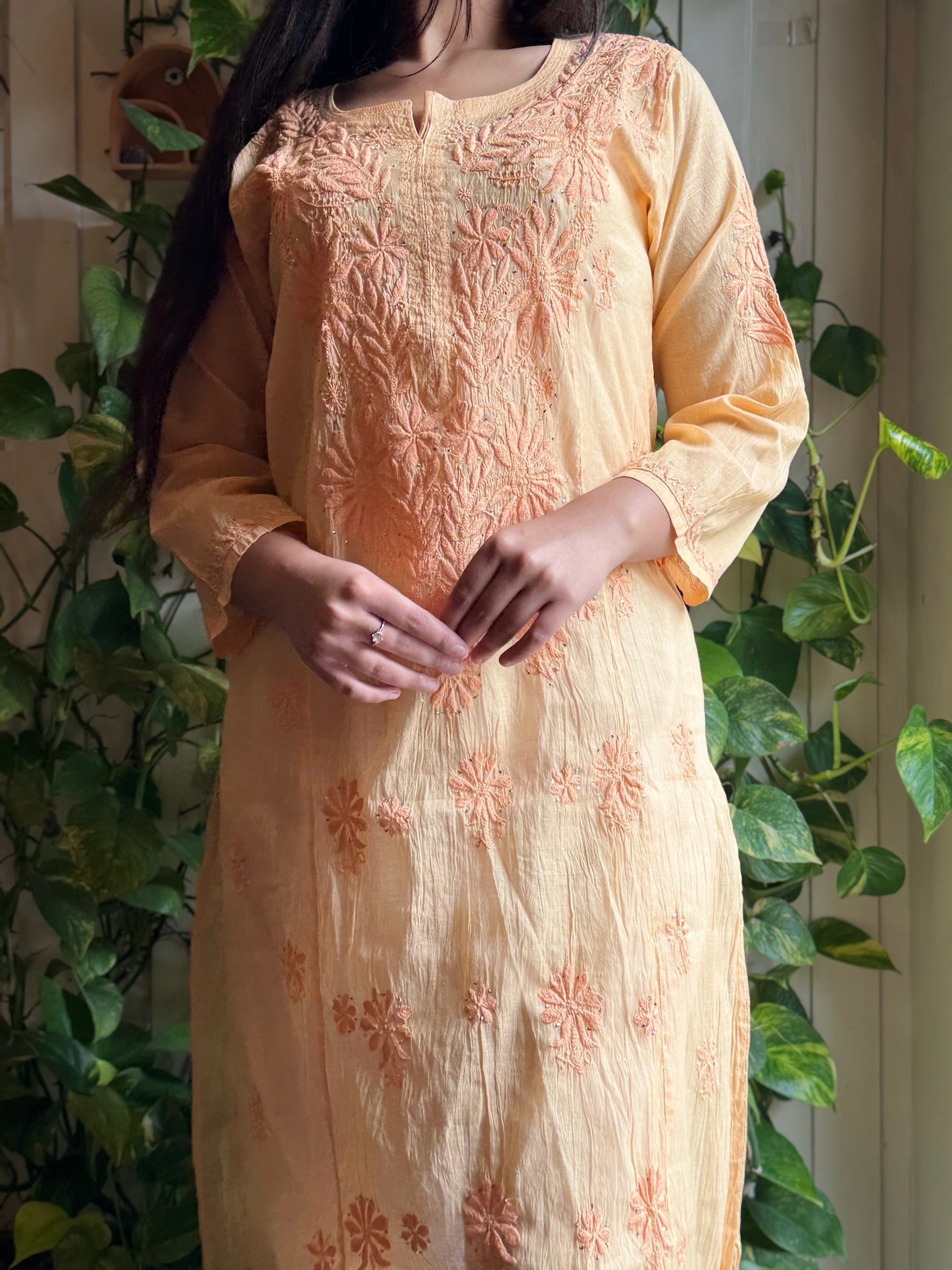 A piece that speaks of summer poetry and royal ease, it drapes like a gentle breeze and carries the soul of Lucknow’s heritage in every stitch. Perfect for festive brunches, intimate gatherings, or moments of quiet elegance — this kurta is an ode to grace, light, and legacy.